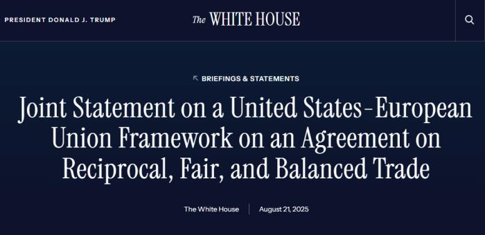 根据中国新闻社Casa Blanca的官方网站,白宫于8月21日在8月21日就当地时间发表了一份声明,即美国和欧盟已经就商业协议框架达成协议。图像来源:白宫官方网站的屏幕截图。声明说,该协议标志着美国对欧盟的关注的认可,表明双方共同承诺解决商业失衡并最大程度地发挥联合经济权力的潜力。声明还说,美国和欧洲将使用框架协议作为加深协作过程的第一步。将来,我们将继续扩大我们的行业,不断改善市场访问条件并增加L双边贸易和投资关系的Evel。